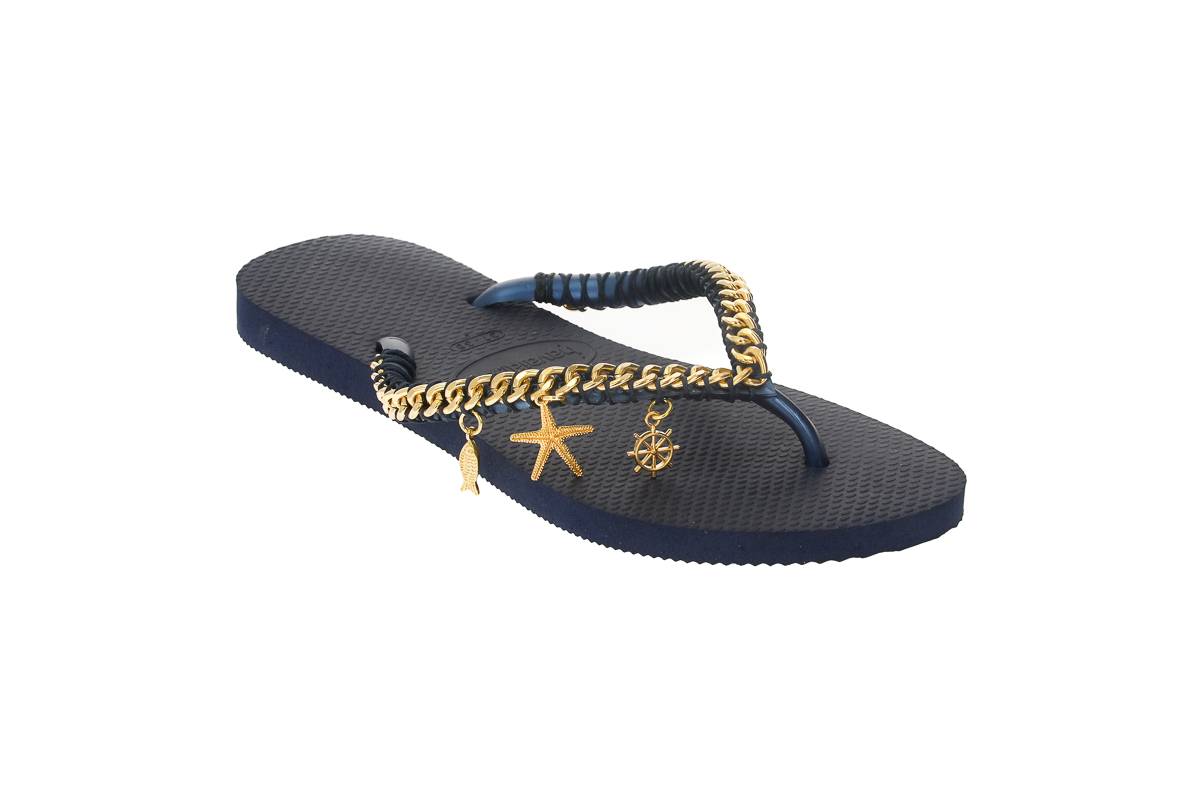 כפכפי הוויאנס בצבע כחול כהה בשילוב שרשרת גורמט זהב בעיטור תליוני ים.